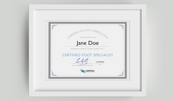 El Programa de Certificació Aetrex és una part integral de l´Acadèmia Aetrex i s´ofereix en 13 idiomes diferents. Aquest programa està dividit en diferents mòduls que cobreixen temes com ara la tecnologia, els tipus de peus, la biomecànica i les millors pràctiques de venda. En finalitzar el programa, hi ha un examen en línia en què els participants poden convertir-se en muntadors de plantilles Certificats d'Aetrex.